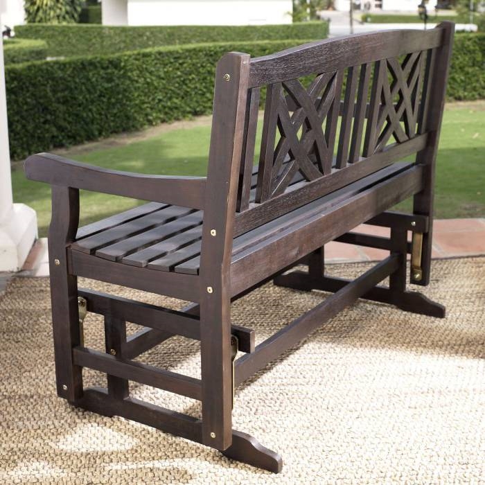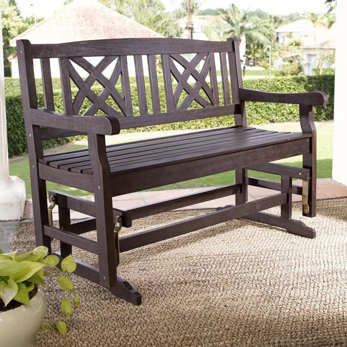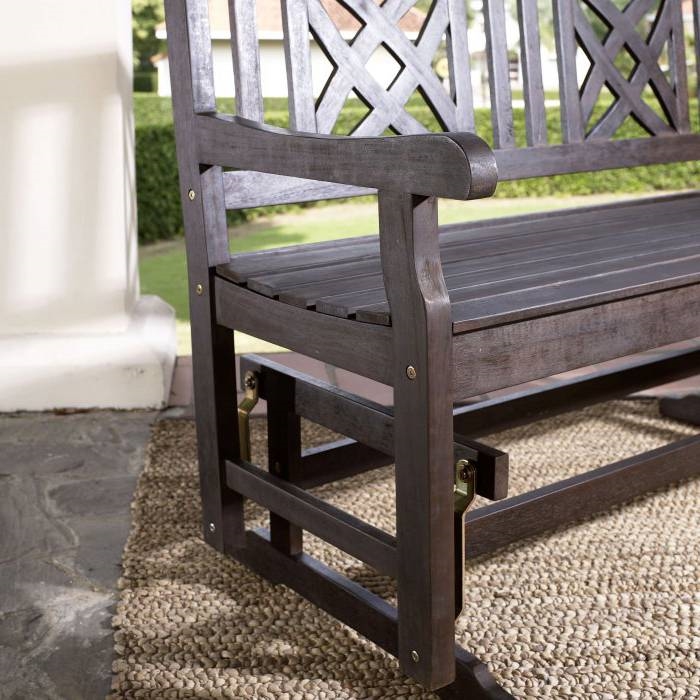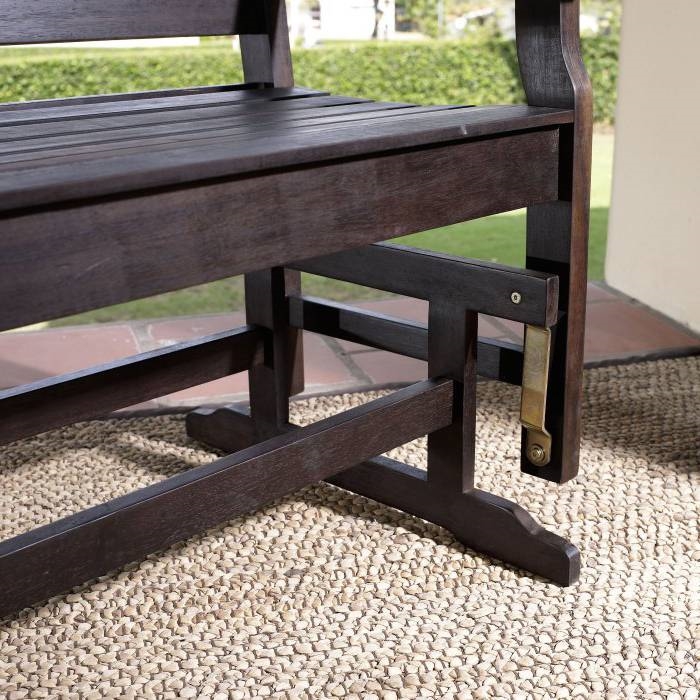 Dark Brown 4 ft. Outdoor Wood Glider Loveseat puts a modern twist on tradition. Crafted with durable, high-quality eucalyptus wood in beautiful dark brown finish, with a stylish garden bench design. Decorative openwork back, Curved arms, a contoured slatted seat, and plenty of promise for relaxing afternoons on the porch or patio round it out. The smooth-gliding base moves the bench seat gently back and forth while also keeping the entire unit firmly in place.