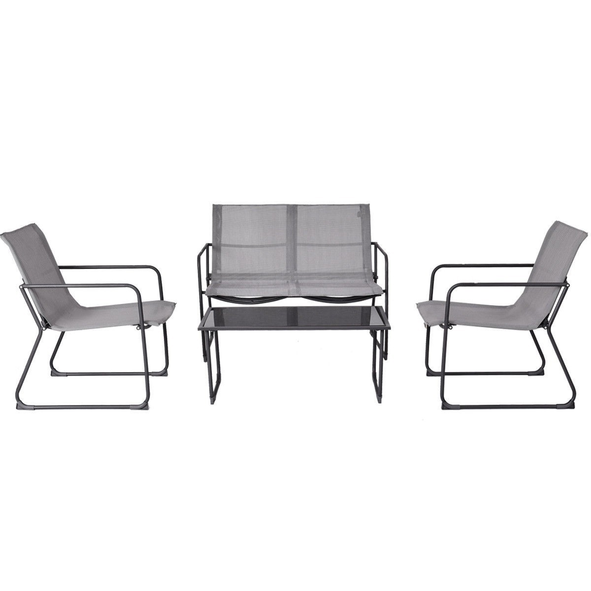 Outdoor Black Steel Frame 4-Piece Patio Furniture Set Brand new and high quality Modern simplicity design, stylish look Strong steel tube frame and durable fabric, sturdy and comfortable, which are of contemporary looks and flavor, offers comfortable and exceptionally stunning outdoor lounging Tempered glass table surface, easy care, and cleaning The durable fabric seats provide more comfortable seating experience Ideal for patio, porch, poolside or garden. It is perfect for the poolside, deck or patio, these comfortable seats will let you and your guests sit back, relax and enjoy the great outdoors Assembly required Color: Black Material: Steel tube + fabric Package includes: 1 x Love seat 2 x Single seat 1 x Coffee table