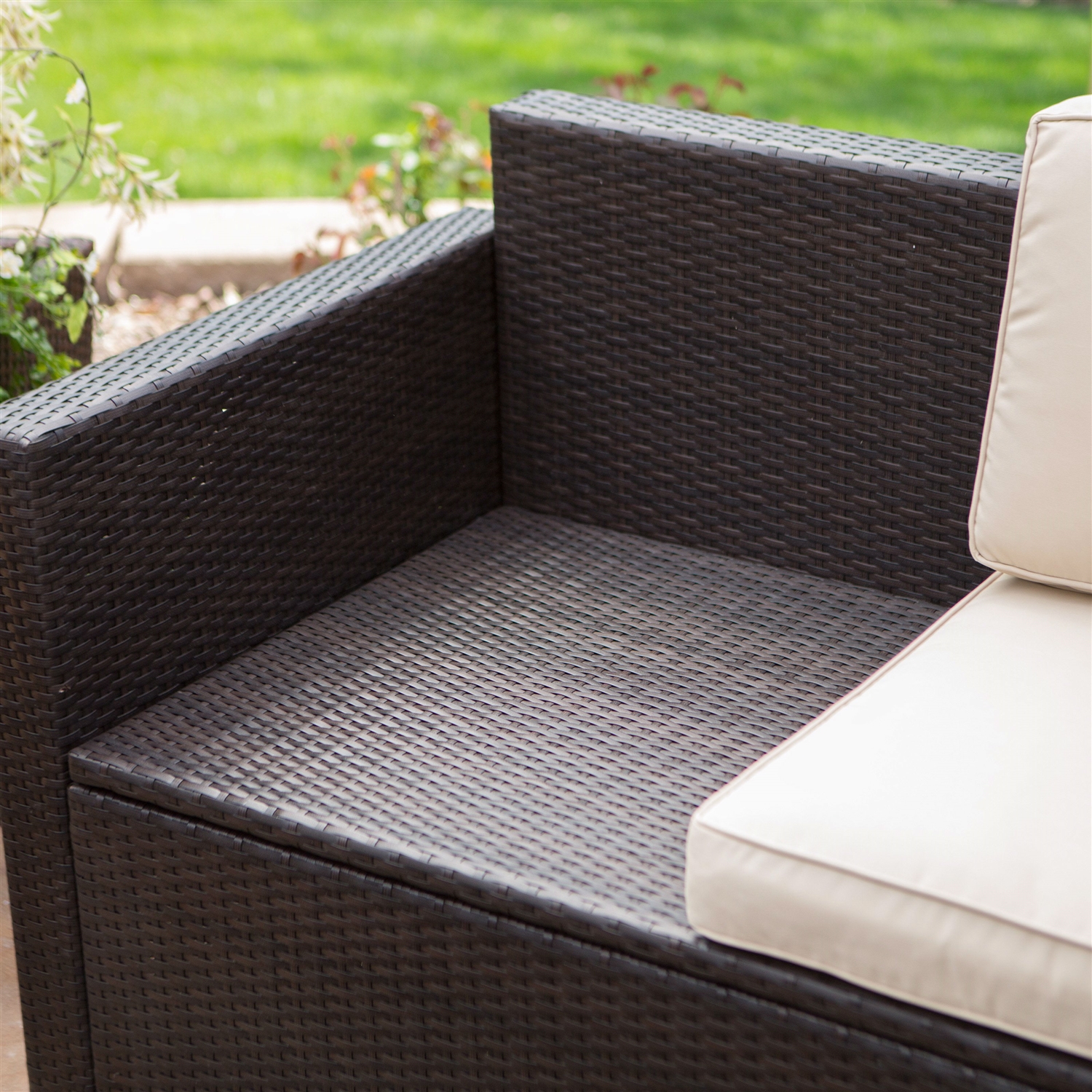 Upgrade your patio to an outdoor living space simply by adding this Outdoor Wicker Resin 4-Piece Patio Furniture Dinning Set with 2 Chairs Loveseat and Coffee Table. This set includes plenty of room for guests to settle in and linger after dinner or for the whole family to spend a cozy afternoon lounging outdoors. It includes two smooth swiveling chairs, a generous loveseat, and a coffee table. The loveseat and coffee table even offer storage to keep your outdoor space tidy! This extra storage space is perfect for pool toys, outdoor linens, and other items. Don’t fret over access, either — the storage areas of these premium pieces are accessible from the front. The chairs and loveseat are topped with plush, removable cushions in a handsome tan shade that offsets the dark brown wicker frames.