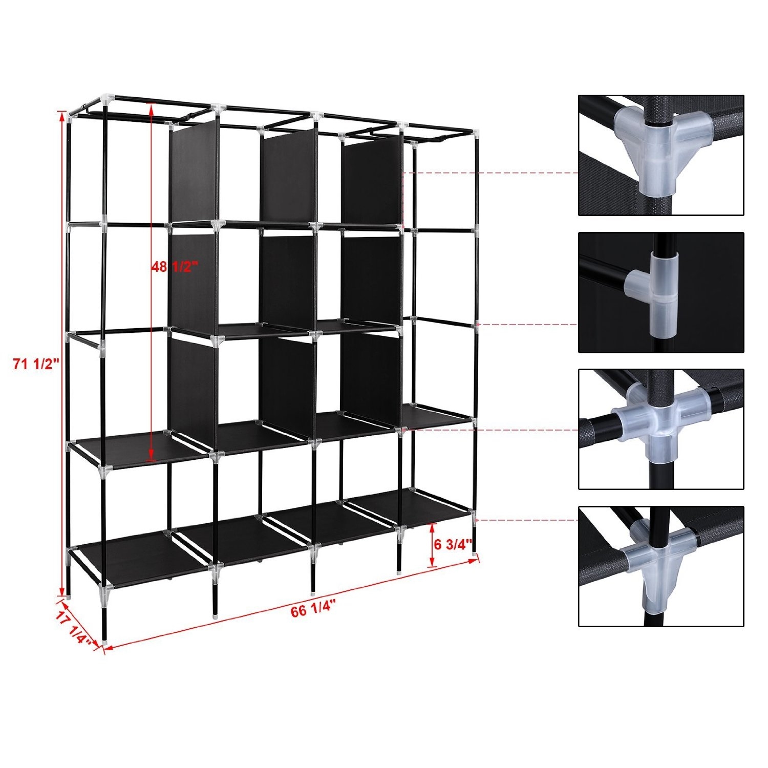 - This size 66 3/4″ x 17 3/8″ x 66 3/8″ /71 1/2″ (with bottom rods) Wardrobe features plenty space inside to divide it into different section for classify storage, Side Shelves stop the clothes falling down from the gaps