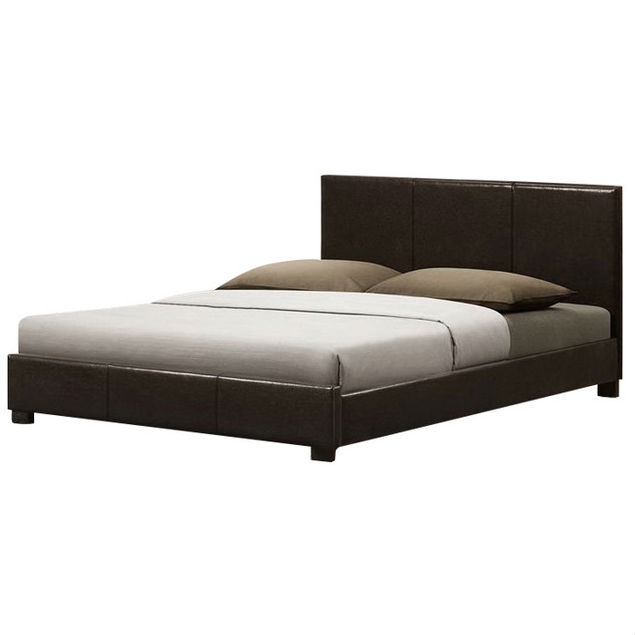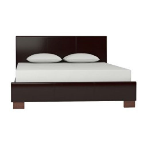 This Queen size Upholstered Platform Bed will transform your bedroom into a pristine, modern oasis. This minimalist designer bed features a sturdy, Malaysian-built frame of rubberwood and engineered wood underneath light foam padding. Sleek dark brown faux leather upholstery and dark brown wood legs finish off the look. This contemporary platform bed requires only a mattress: slats (included) serve as a box spring. The bed requires assembly. To clean, wipe with a damp cloth. overall dimension: 62.5″W x 84.5″D x 33.5″H, side rail: 7″W x 80.5″Dx 9.75″H, foot board:62.5″Wx10.75″H, height to top of slat: 7.25″, height of legs: 5.5″.