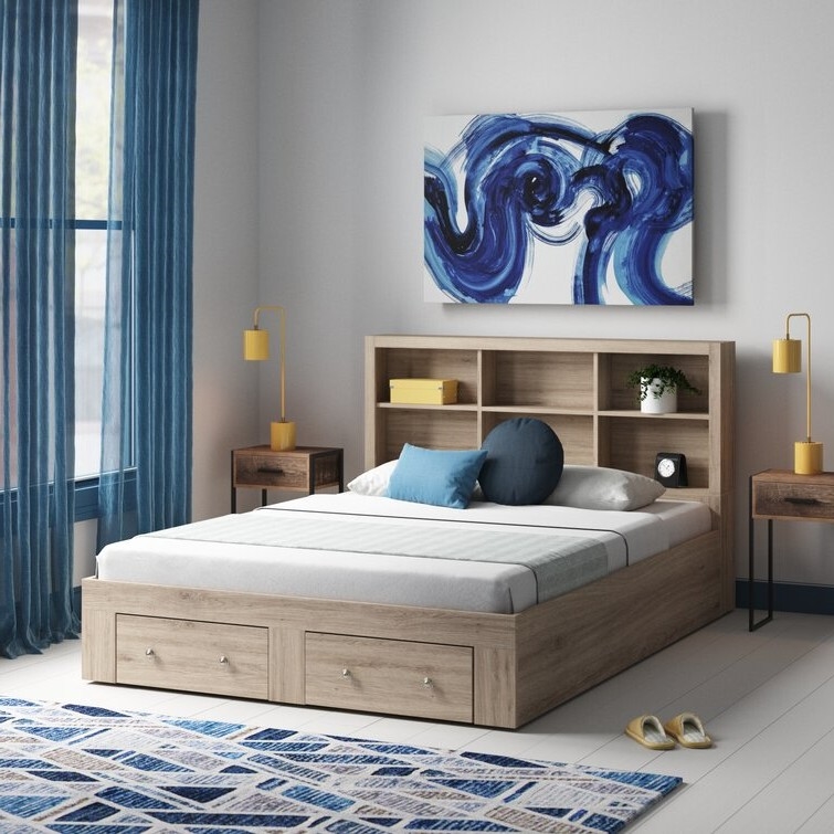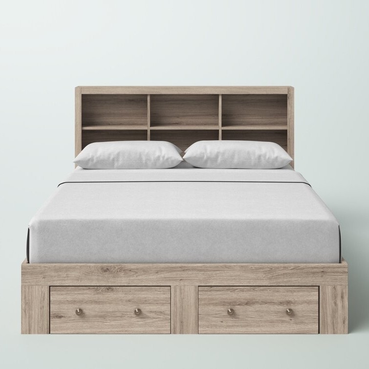 This Queen Size Rustic Oak FarmHouse Low Profile 2 Drawer Storage Platform Bed brings plenty of spare storage space for all your clothes. It’s made from solid and engineered wood in a rustic oak finish with visible wood grain. The headboard has 6 open cubbies where you can keep nighttime reads, framed photos, or a few potted plants. In the footboard, there are 2 drawers that provide essential spare storage for your linens or sweaters. This bed arrives with slats and center support legs, so you don’t have to use a box spring with your choice of mattress.