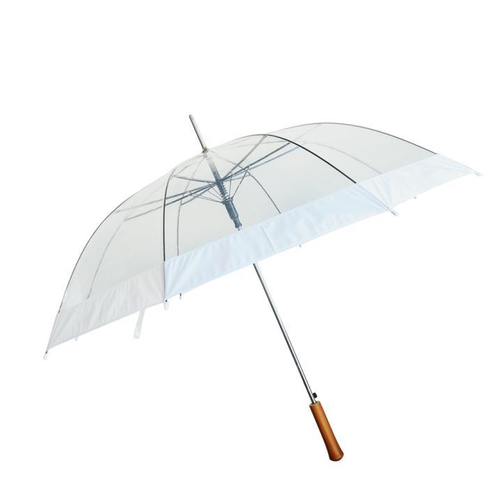 n48″ Clear/Transparent Auto-Open Rain Umbrella with White Ring by Barton Outdoors®nnThis 48″ clear umbrella with decorative white ring is perfect for use in the rain or as a decoration in weddings and other projects. The solid wood handle, metal shaft and unique clear color combine to form a decorative and functional automatic opening rain umbrella with aesthetic appeal. This umbrella features a low wholesale price, plastic tips at the end of the “ribs” for safety and a button snap closure. Sorry, no refunds, returns or exchanges on white umbrellas. Look up briefly while it is raining and watch the rain drops slide right off. Each umbrella is individually wrapped in cellophane. Sorry, no refunds, returns or exchanges on clear umbrellas.nnn: $19.95 n1.00 pounds each, Item UMCLEAR48W