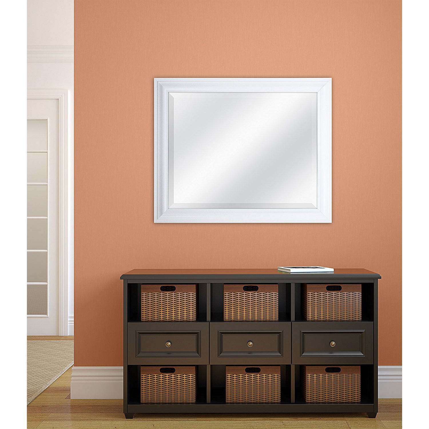 Rectangular 32 x 26 inch Bathroom Wall Mirror with 1-inch Bevel and White Frame Mirror Includes 1-inch Bevel Wide 2.5-inch Frame Molding 26 by 32-inch is the overall size of the mirror including reflective area and molding Hangs vertical or horizontal D Ring hangers included