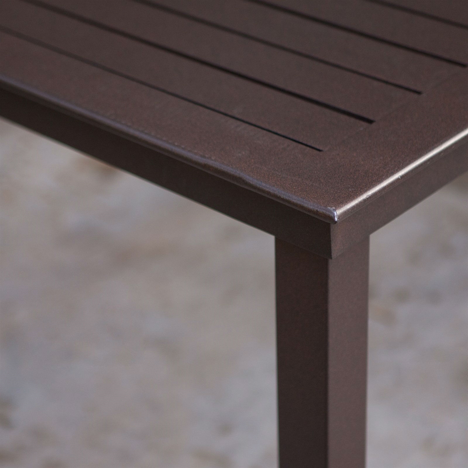 You may want to call in sick to work, or you could just invite your boss over to spend the afternoon lounging around this Rectangular 74 x 42 inch Patio Dining Table in Mocha Brown with Center Umbrella Hole. This modern outdoor table is crafted from corrosion-resistant aluminum that’s available in your choice of pleasant finishes. The slat top is easy to clean and adds a look of length to this long dining table. A central umbrella hole also gives you the option to add shade to increase the hours you can spend enjoying your patio or poolside.