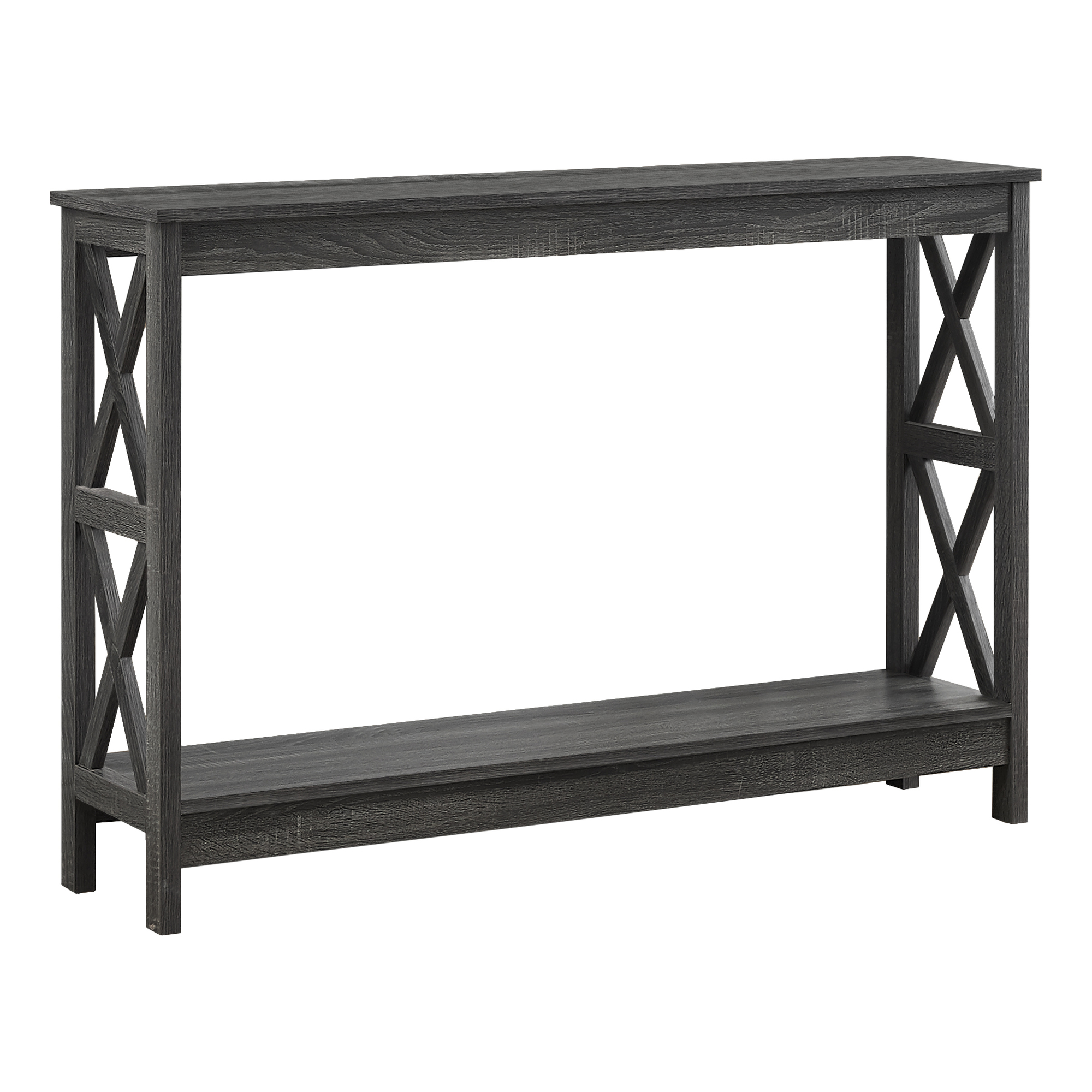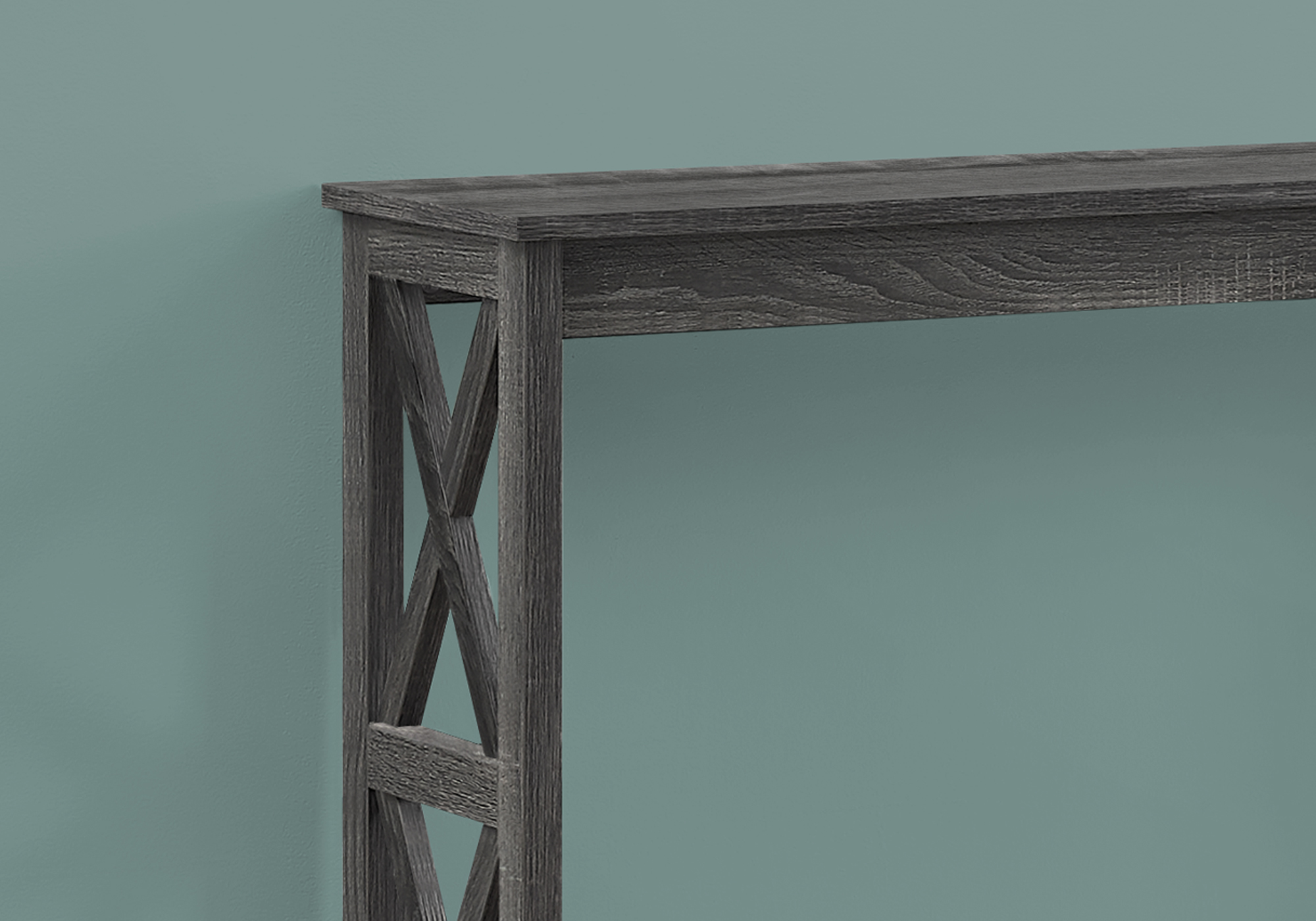This transitional style hall console table is a great canvas to showcase your decorative flare. A rich and smooth, laminated grey wood look finish on all sides, this rectangular accent table is joined with a thick X-frame at each end giving it a warm appeal. With an open bottom shelf for extra storage, this console table is versatile enough to bring into other spaces to display treasured photos and objects, books, or even as a place to set a tray of appetizers when entertaining. There are so many creative uses for this table and the long, narrow size makes it ideal for small spaces. Assembly is required.