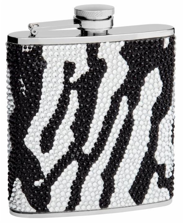 nThis beaded hip flask features a brilliantly designed zebra pattern made from authentic rhinestones. The flask holds 6oz of your favorite liquor. The flask is very pretty and sparkly. Some of the key advantages of owning this bling flask are: