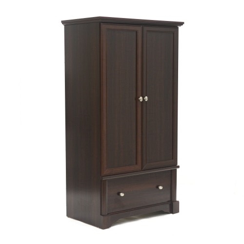 Versatile storage and elegant style where you need it with this Rustic Cherry Drawer and Garment Rod Wardrobe Armoire. Behind the 2 large doors, this wardrobe armoire features a hidden storage area that provides you with room for all your essentials. This sturdy armoire includes a garment rod so you can conveniently hang and organize all apparel. Also features a storage drawer that opens and closes on smooth metal runners for easy access.