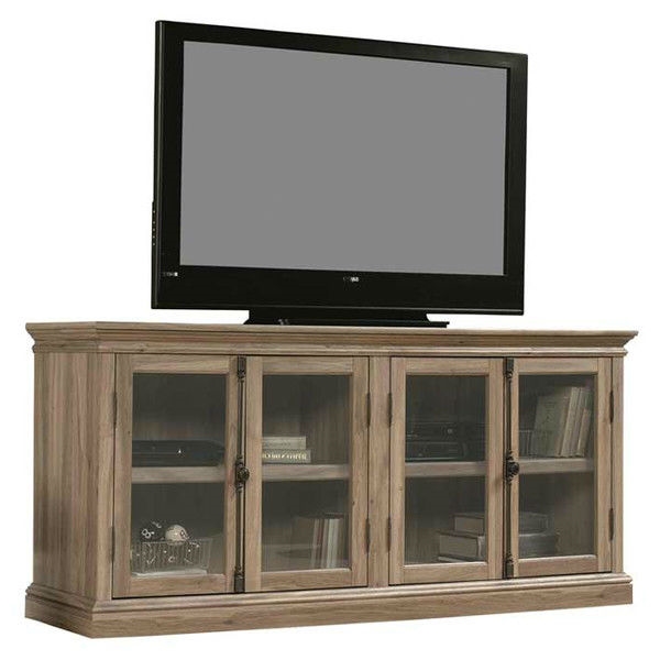Salt Oak Wood Finish TV Stand with Tempered Glass Doors – Fits up to 80-inch TV