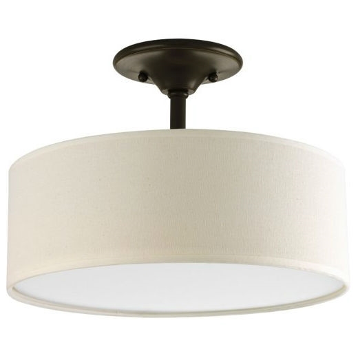 Semi-Flush Mount Ceiling Light w/ Round Off-White Linen Drum Shade in Antique Bronze