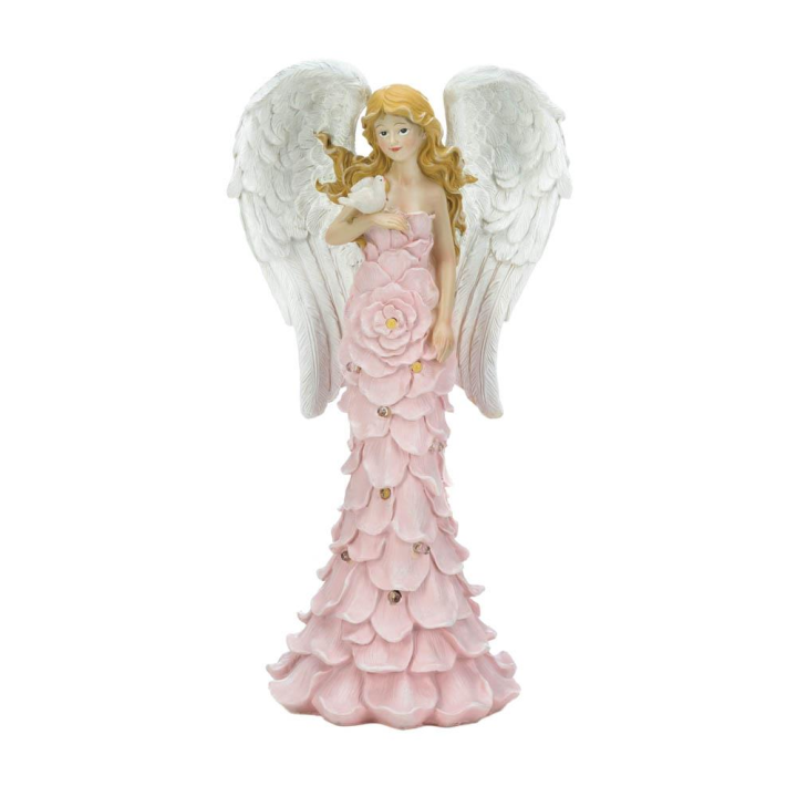 - Add a calming presence to your outdoor space with this charming angel garden statue. This beautiful garden angel features a solar powered design that illuminates the pink rose dress and the bird at night.