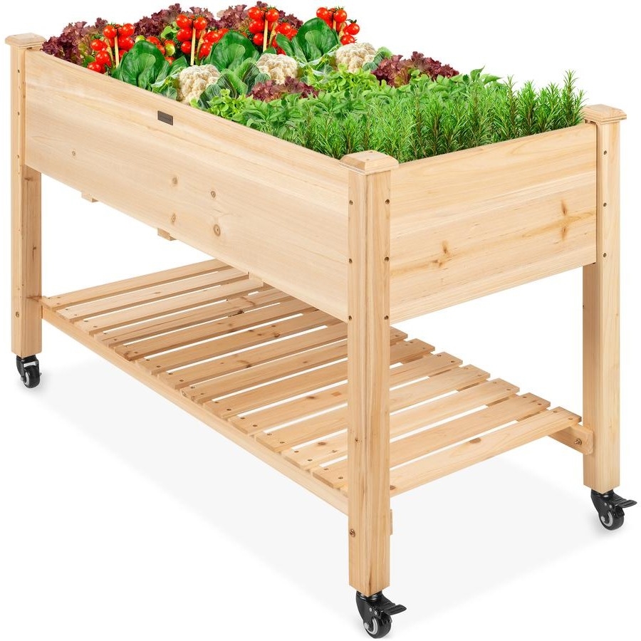 Solid Wood Locking Wheels Raised Mobile Garden Wood Planter Elevated Planter