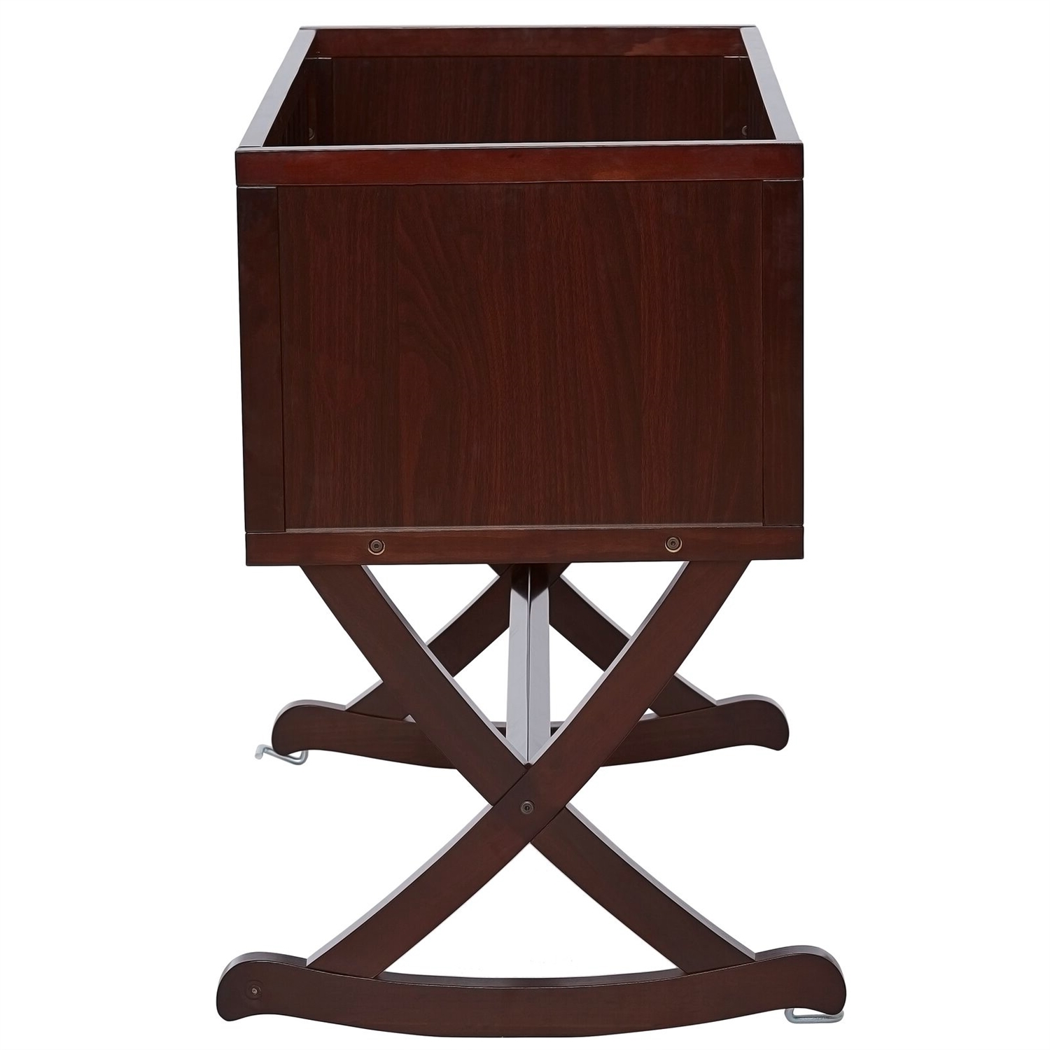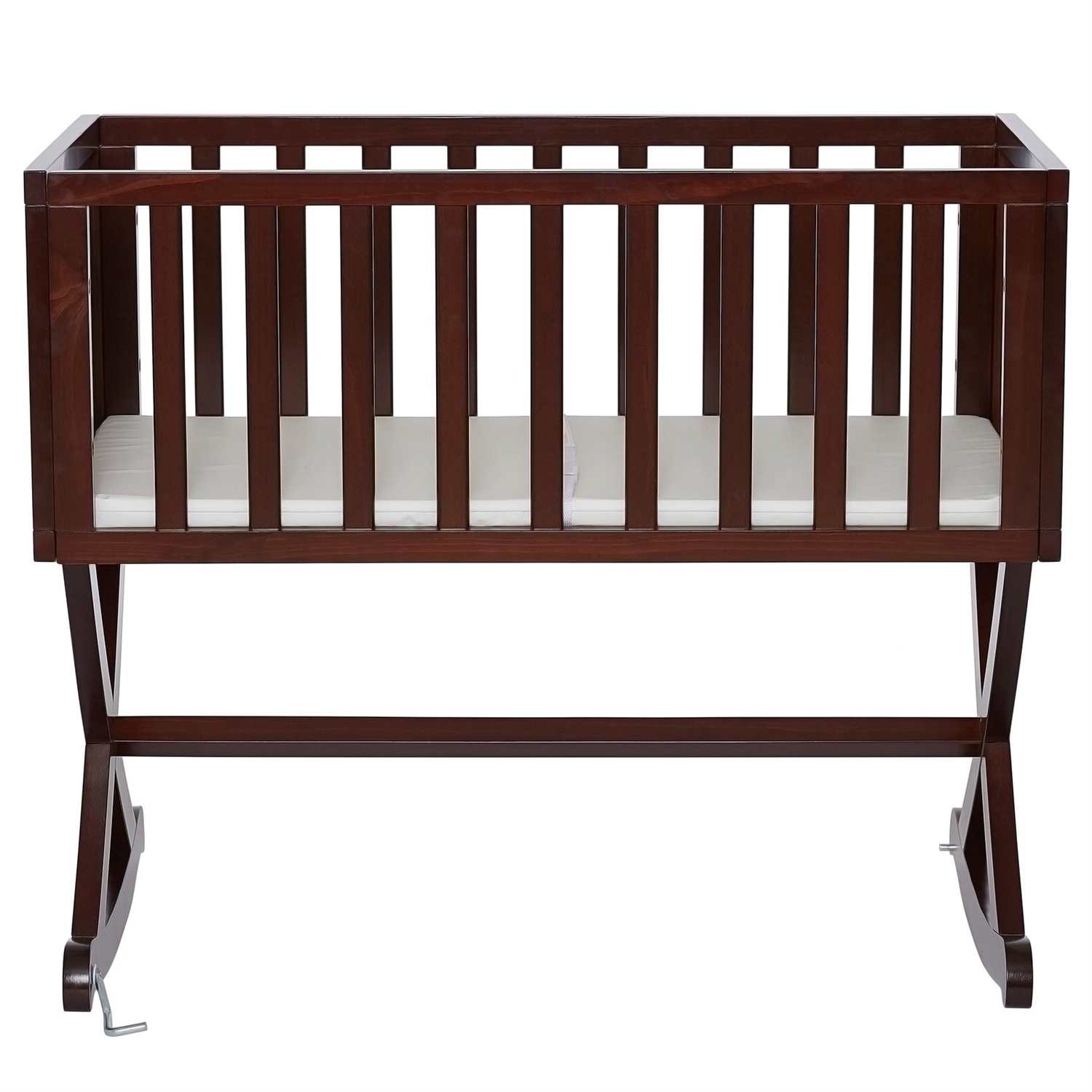 This Cherry Finish Wood Rocking Baby Glider Cradle with Crib Mattress creates a cozy nest-like surrounding for your newborn. This cradle offers a simple and modern design by incorporating straight lines, a solid side panel with a soft mattress pad, and an x-cross base, which allows parents to rock gently their babies to sleep with sophisticated iron decors and pops of geometric prints that inspire a plush, peaceful, all-night comfort.