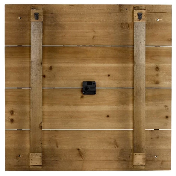 Square 27.5-inch Wood and Metal Wall Clock Industrial Style Crafted from iron and pine Perfect for industrial or modern farmhouse themes Frame Material: Wood Color: Gray/Brown Batteries Required: Yes Location: Indoor / Outdoor Use Purposeful Distressing Coat/Paint Distressing Paint is purposely rubbed or scraped off for a distressed look