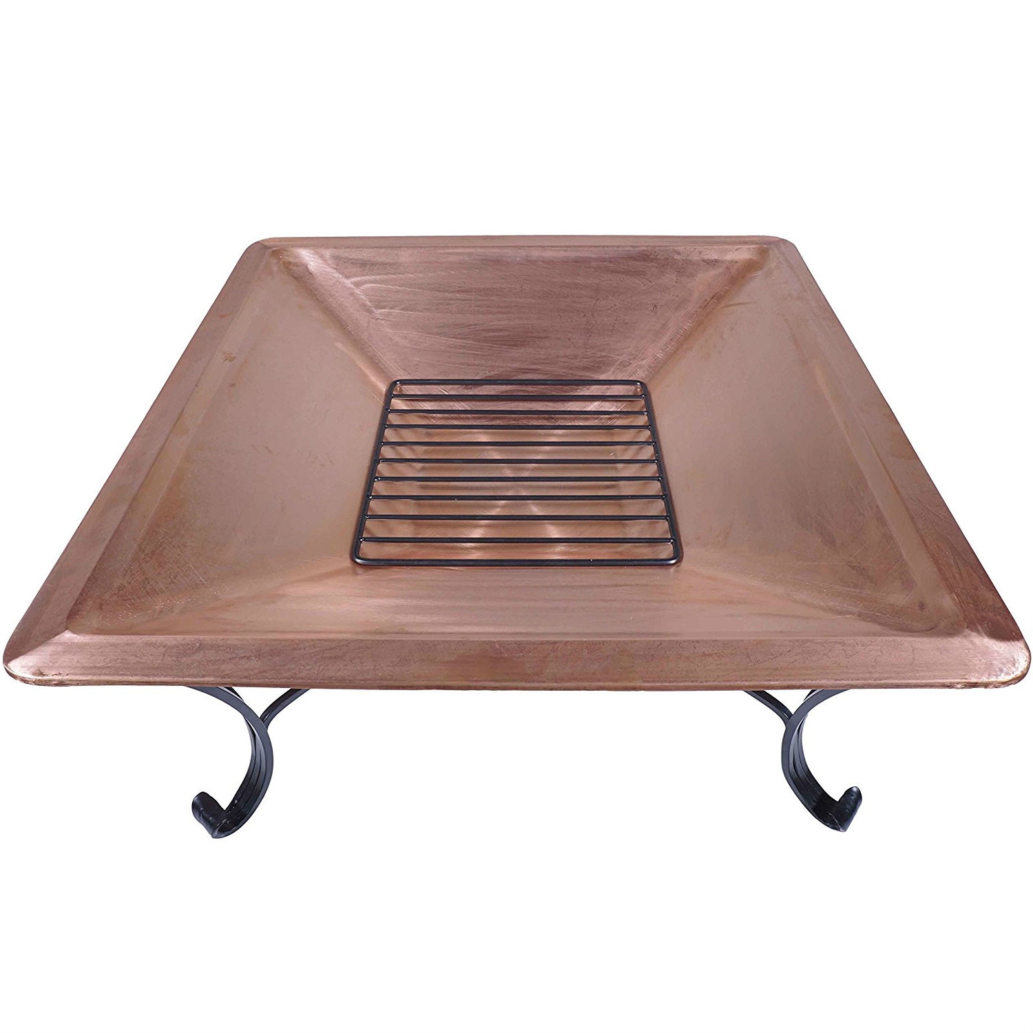 Square 33-inch Solid Copper Fire Pit Bowl with Iron Stand and Screen BUILD AN OVERSIZED FIRE Fire bowl is a 33”x33” square and 6” deep, bottom of the bowl sits 8.25” off the ground, 19.5” total height with spark screen, 14” total height without spark screen ELEGANT CONSTRUCTION Steel fire pit with an elegant 100% solid copper fire bowl ACCESSORIES INCLUDED Includes 30”x 30″ diameter spark screen, 20” poker/lid remover with wooden handle, and 14.25”x 14.25” square log grate inside the fire bowl to increase air flow EASY ASSEMBLY Owner’s manual included to walk you through the 5 minute assembly! Available in 39” LW, 29” LW, 33” Square, and 40” Premium models to suit everyone’s preferences