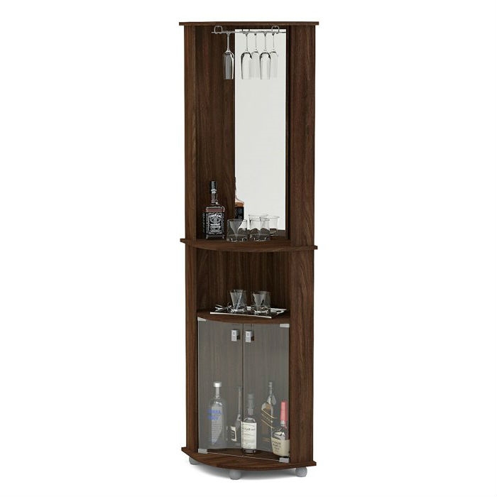 Turn any corner of your home into a stylish bar area with the addition of the Sturdy Modern Espresso Corner Classic Home Bar. This unit features bottle storage behind glass doors. Shelves allow you to display glasses and other bar essentials. The top is outfitted with a hanging wine glass rack to enhance functionality.
