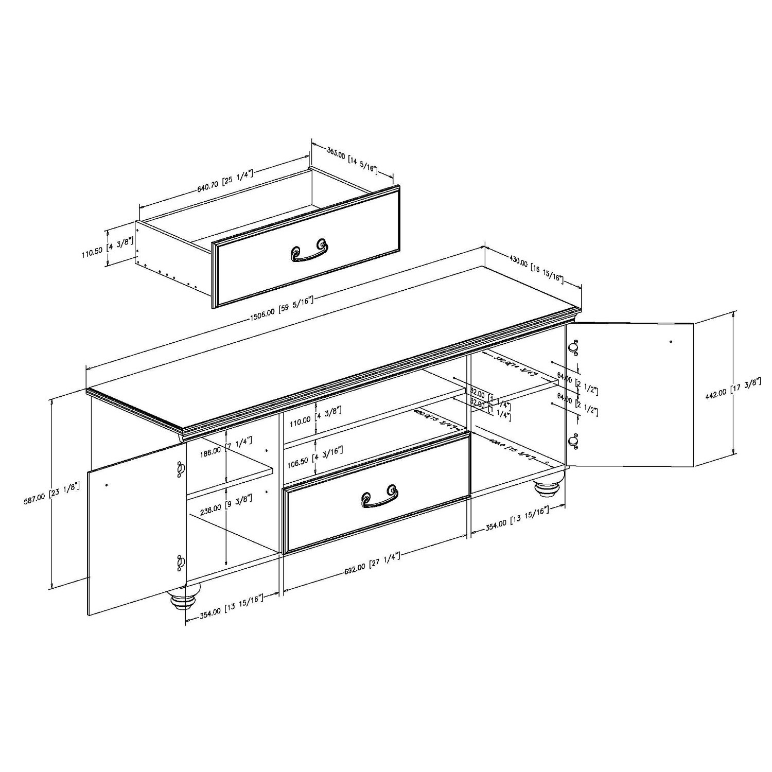 You will love this Traditional Style TV Stand in Dark Mahogany Finish – Fits TVs up to 60-inch. Find your comfort zone with Noble collection that combines the timeless look of a dark mahogany finish with elegantly shaped legs and pewter finish metal handles. Featuring classic lines and abundant storage for electronic equipment, DVDs, CDs, books or clothes, the Noble TV stand is even suited for placement at the foot of your bed. Presents 1 drawer with metal slides, 2 close and 1 open storage spaces. For complete interior dimensions, see spec sheet. It can accommodate a TV up to 60-inch. Its weight capacity is 185-pound and the back is not laminated. It measures 59-1/4-inch wide by 17-inch deep by 23-1/4-inch high. It is delivered in a box measuring 66-1/2-inch by 22-3/4-inch by 6-1/2-inch and weighing 107-pound. Also available in a narrower version for TV up to 42-inch. Made of non-toxic recycled CARB2 compliant laminated particle panels. Complete assembly required by 2 adults. Tools are not included. 5-year limited warranty. Made in Canada.