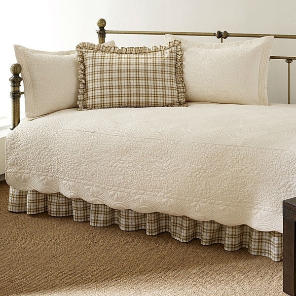 - Twin 5-Piece Daybed Quilt Set with Scalloped Edges in Ivory Cream White Beige