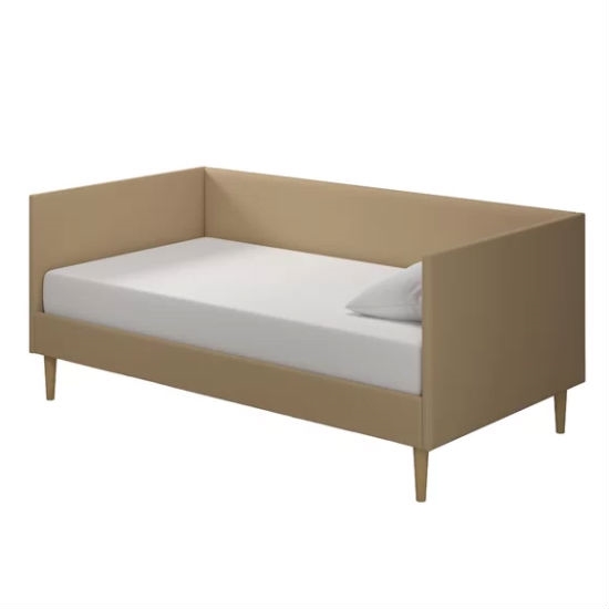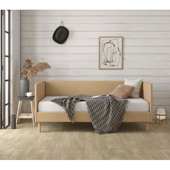 Twin Mid-Century Modern Tan Linen Upholstered Daybed Frame Material: Solid + Manufactured Wood Mattress Included: No Trundle Bed Included: No Slats Included: Yes Assembly Required: Yes Upholstered Upholstery Material: 100% Linen