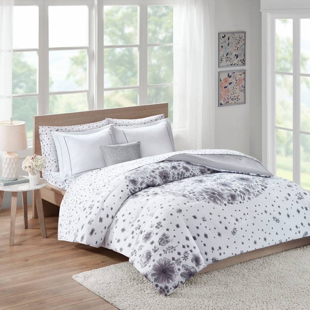 - Twin size 6-piece White Grey Floral Pattern Microfiber Comforter Set