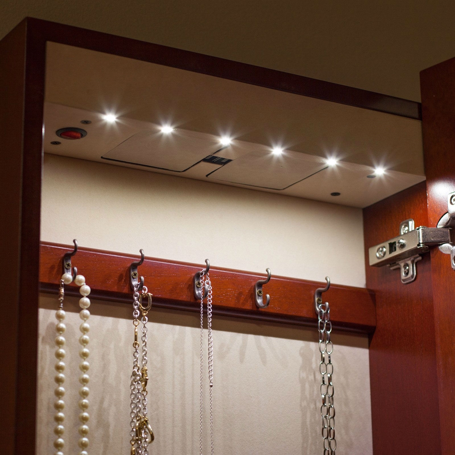 This Wall Mounted Locking Jewelry Armoire with Mirror in Cherry Wood Finish reflects your good taste in home decor as well as your smart ensemble. Once you’ve chosen the best accessories for your outfit from the selection stored inside, you’ll use the mirror for a final glance as you depart for work, an evening out with friends or any other occasion. Traditional in style, finished in an elegant Cherry hue, yet modern with its LED lights tucked inside this casement for easy accessory selection, this space-saving piece of furniture will provide organization to your treasured pieces. The numerous hooks, trays, shelves and slots will store necklaces, earrings, rings, bracelets, watches, pins and more, nestled against the soft, felt-lined interior.