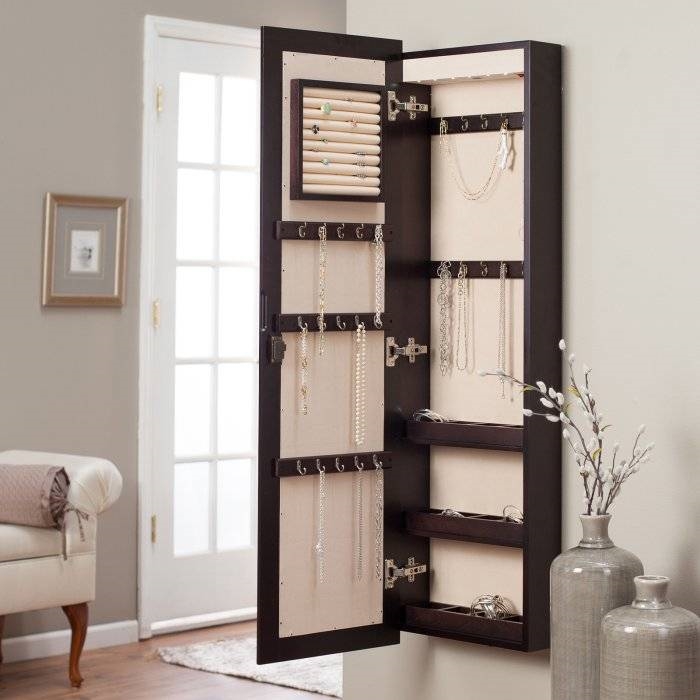 - Wall Mounted Locking Jewelry Armoire with Mirror in Espresso Wood Finish