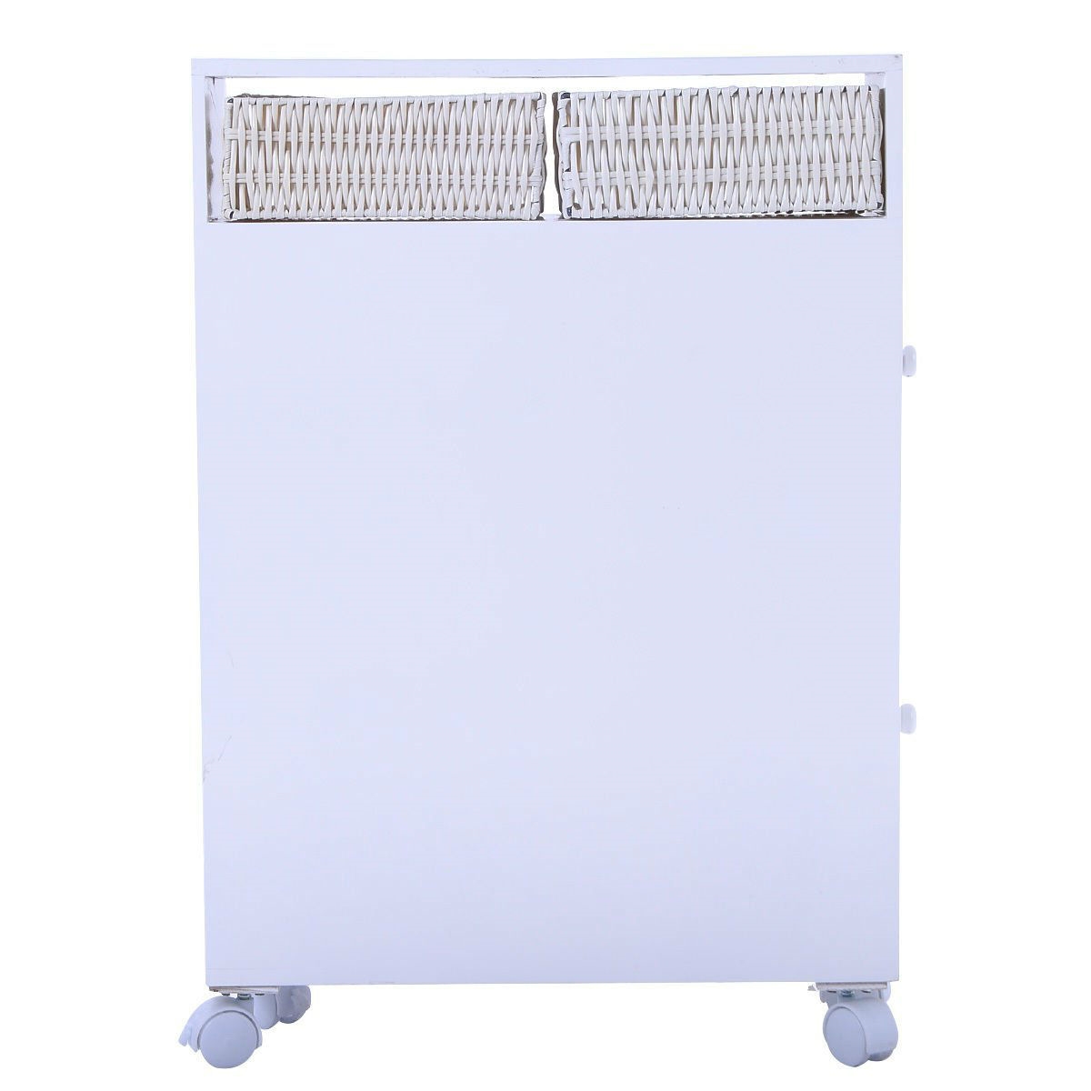 White Bathroom Storage Floor Cabinet with Baskets and Casters High quality and brand new Crafted from wood for an authentic look and feel Features a subtle white finish for a clean appearance Two drawers and two baskets Small footprint to fit in any bathroom Material: MDF wood Color: white Package Includes: 1 x Floor Cabinet, 2 x Baskets Multiple Values & Premium Performance With various drawers, baskets and cabinets design, you can surprisingly place your newspapers, magazines, toiletries, shampoos, creams, towels as you like The lightweight slide-out bathroom floor cabinet helps you to make full use of space Its premium performance can totally meet your demand of toilet storage Optimal Organizer & Space Saver It maximizes your bathroom’s available space while providing functional storage, which also makes you quick access to your bathroom accessories The unique cabinets design can perfectly improve the storage efficiency, which also brings a reliable using experience Sturdy Body & Solid Shoulder Sturdy construction made of MDF material features solid and stable while shouldering your tissues and various kinds of bathroom essentials It is surely your reliable helper in refreshing your bathroom to a neat and organized place, which can bring you a long lasting using satisfaction Simplistic Style & Concise Appearance Simplistic style with white brings you a brand new feeling of style It is also a perfect decoration to fit your bathroom and offers you both concise and convenient life style Portable & Mobile Design Equipped with four casters, this cabinet is easy to pull out and push back, and it can move across most floor surface smoothly It is an ideal product for your modern home