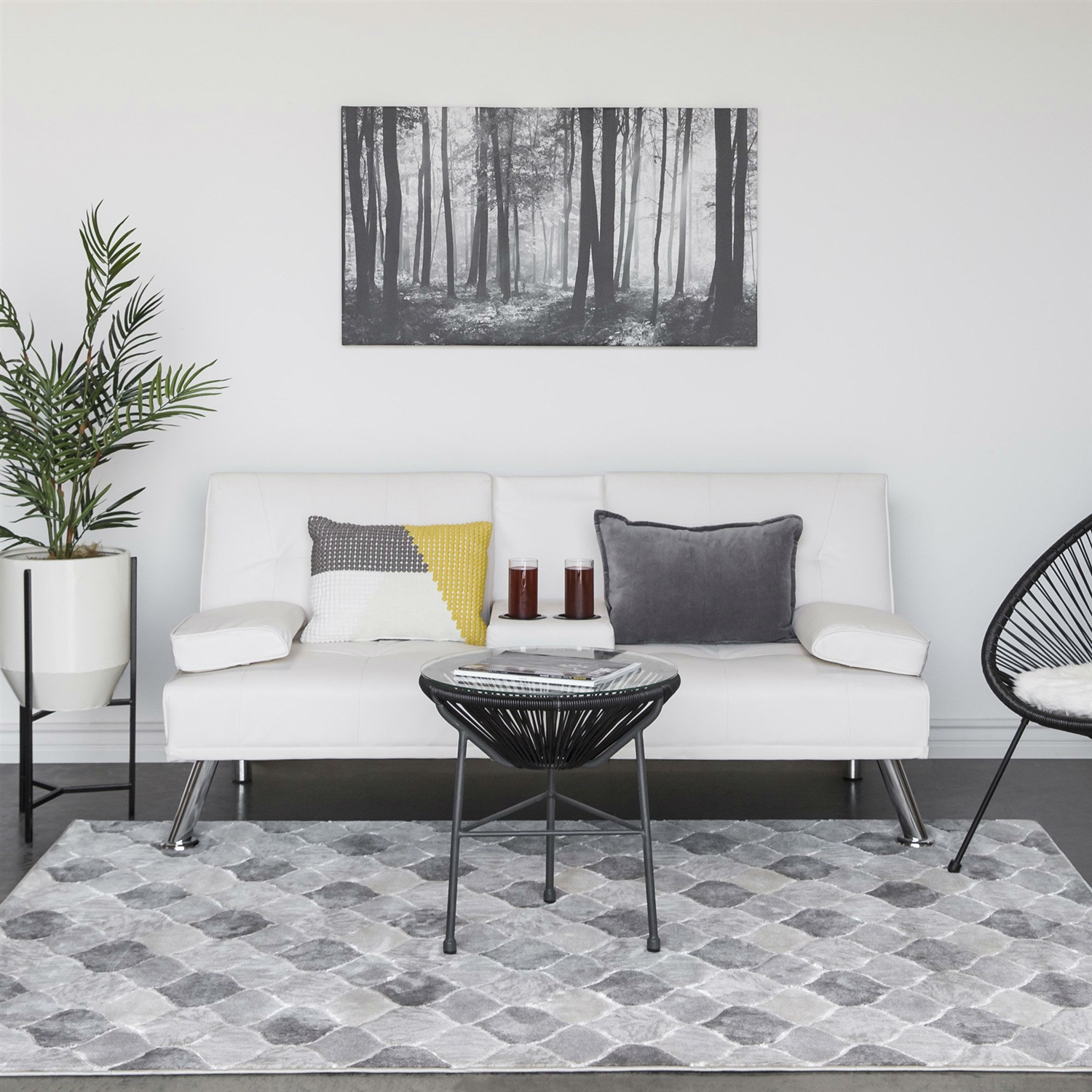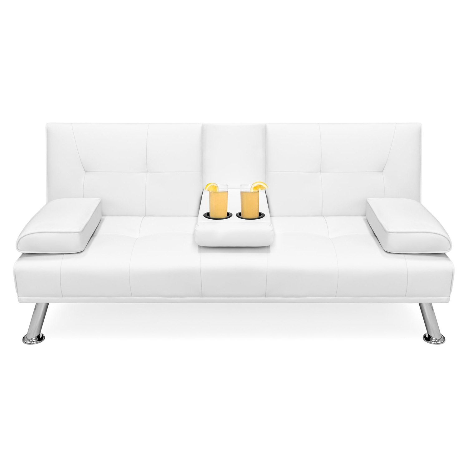 White Faux Leather Convertible Sofa Futon with 2 Cup Holders