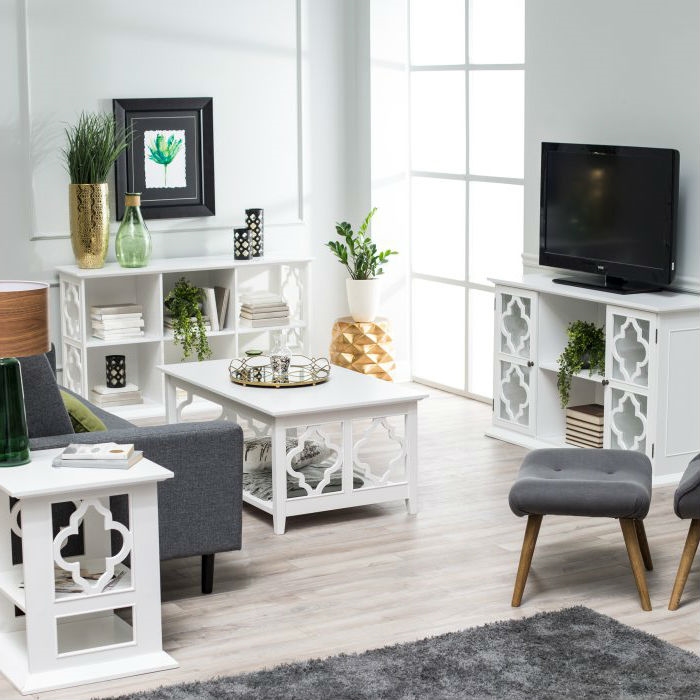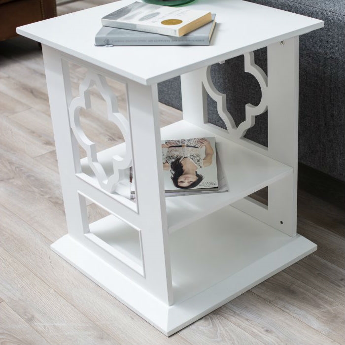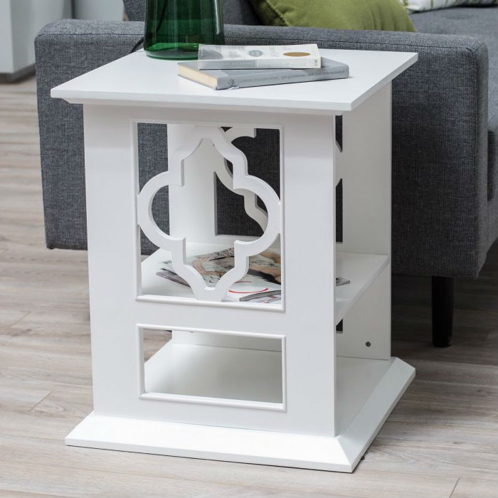 This classic white wood side table adds exotic charm to your space. The frame is crafted of birch solids and shelves are made of sturdy engineered wood. Select painted finish options and a simple frame design let the quatrefoil side cut-outs create the exotic look. Two shelves ensure plenty of space for display pieces and the top has ample room, too. This table is perfect between two chairs, beside your sofa, or as a dashing nightstand.